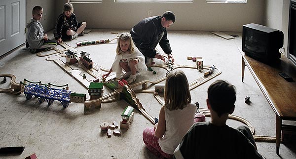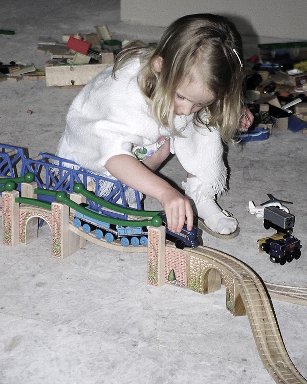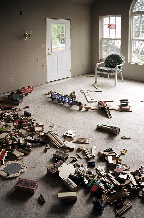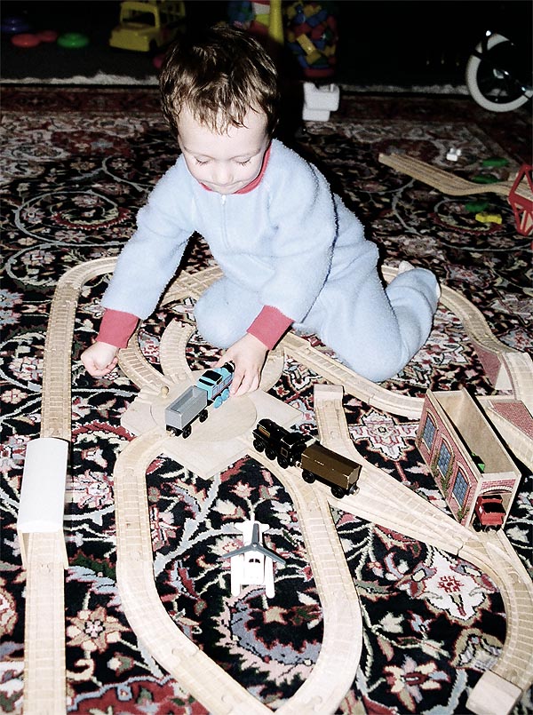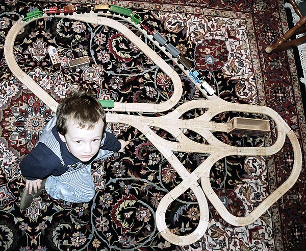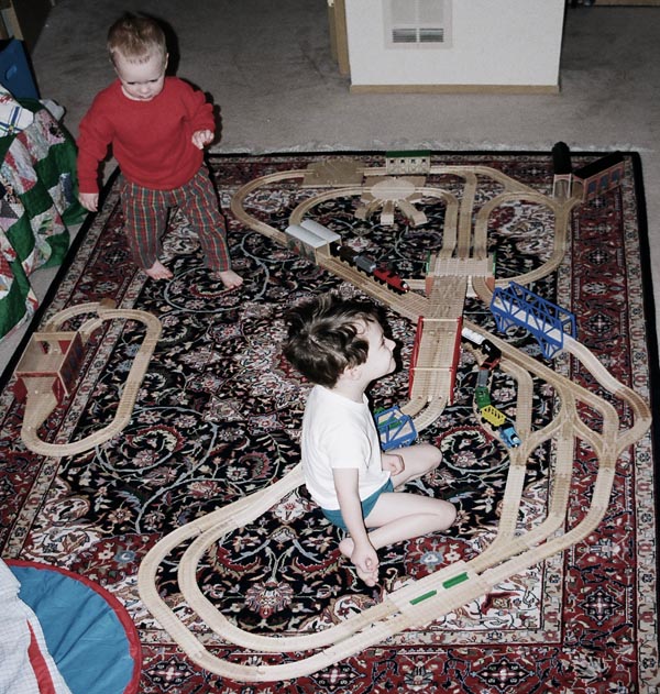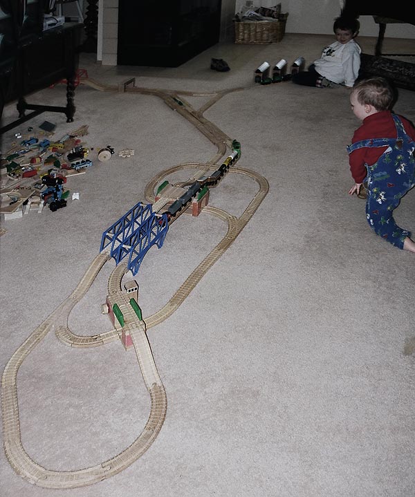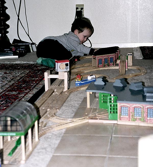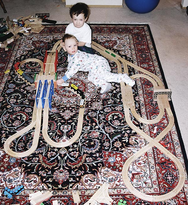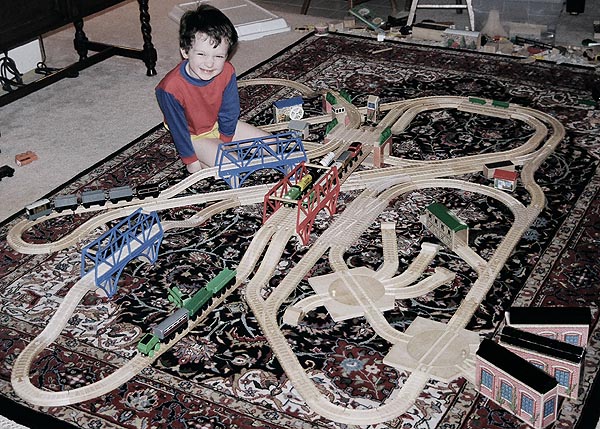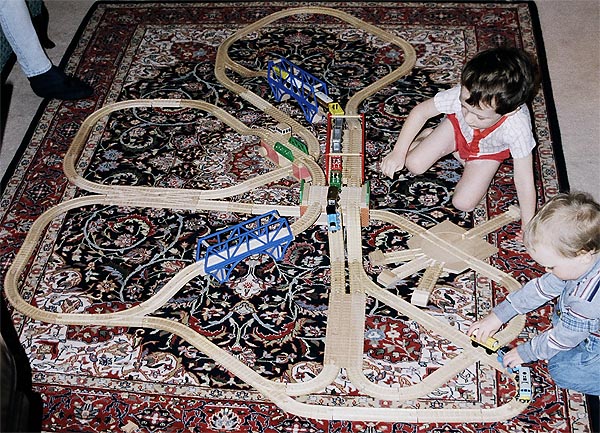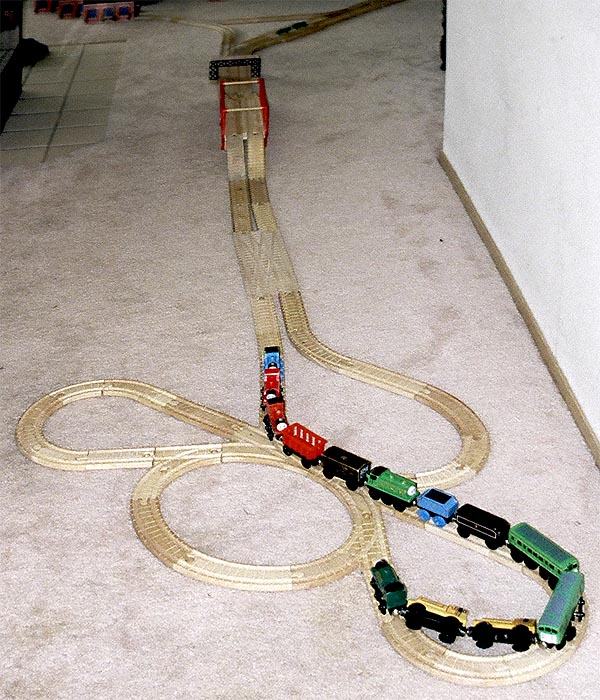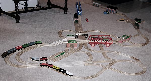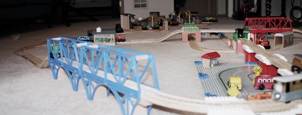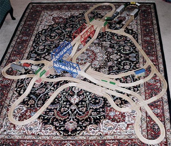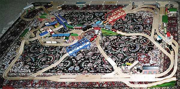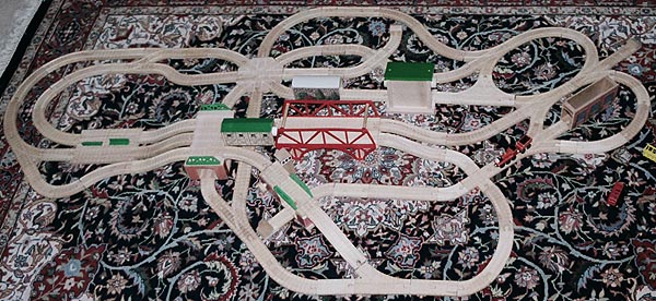 These are some of the many layouts constructed when Andrew and Douglas were little. Some of these pieces have been boxed up and put away for their children to play with some day too... Several incorporate Woodtown roads, Lego risers, or architectural blocks.