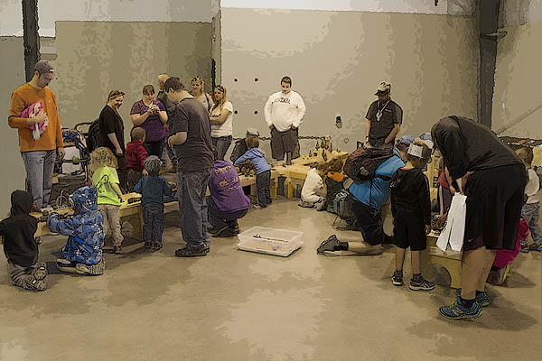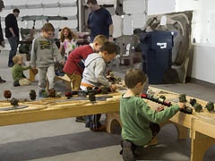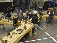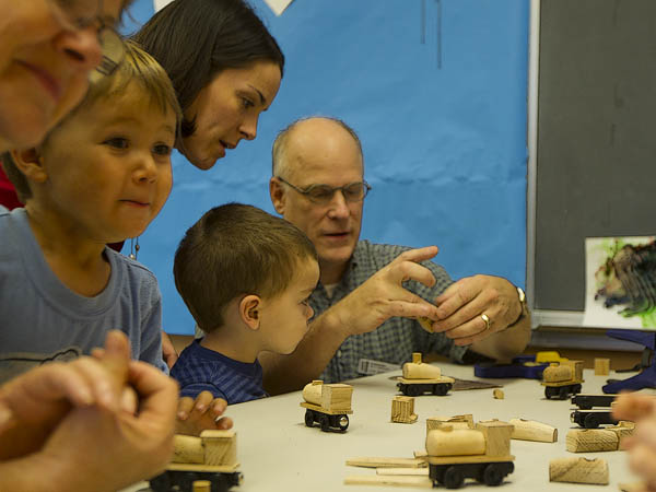 Wooden Railway Clinic - Steilacoom Kids Club. Both of my parents are in this picture, helping children and their parents with creating their train, building and trees at this event. The modular railway was in the wagon shop, a historic building nearby.