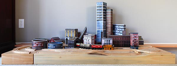 Tee (bottom) with buildings temporarily placed (and extra leg supports stacked)