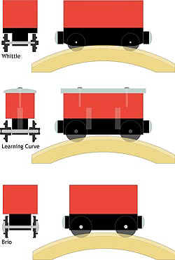 It should be noted that the ratio of height to width to length for cars commercially available from various manufacturers vary. Thomas™ cars are narrower, Orbrium and Brio® cars are shorter, and Whittle™ cars have a smaller wheel size. These differences are apparent in the comparative views of standard length cars shown and can impact which track pieces will work best on your layout. Shorter cars navigate through short switches and curves better, while smaller wheels may cause cars to drag on tight radius arch bridges.
