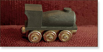 Parts are available for creating custom engines and cars. Shown are ceramic magnets, rounded couplers, and wooden wheels that can be found at Cherry Tree Toys and other sources. The wooden wheels have a 1/8” diameter hole and accommodate a dowel or screw for the axle.