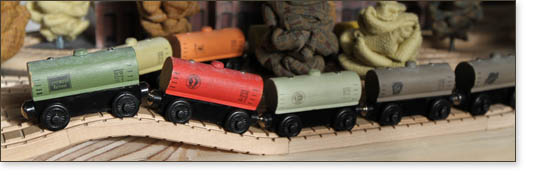 Milk and clay paints come in a wide range of colors and add a natural warmth and natural tone. Milk paint is a kid-friendly way to decorate trains. A broad spectrum of paints made from milk casein and food grade emulsifiers and preservatives are available. These smell great, but I haven't tried tasting them... Clay paint can be used to color wash the modules. Custom product names and corporate branding can be inked onto painted rolling stock. Create your own company names with imaginative products and create custom rubber stamps - or write directly on the cars with permanent ink.
