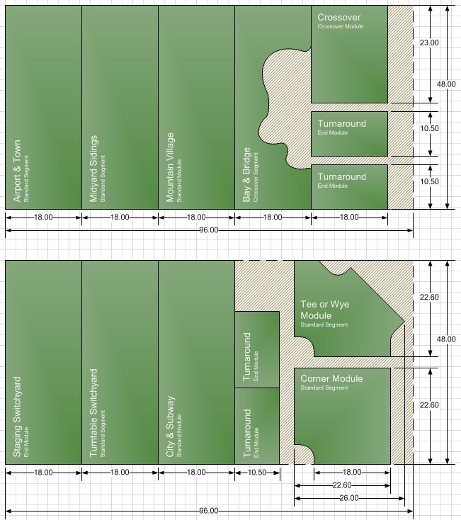 Consider using 1/2" apple ply cabinet-grade plywood for a strong, stable playing surface. These come in 5'x5' and 4'x8' sheets. Shown is a layout template based on two 4'x8' sheets that yields 6 standard modules, 2 crossover modules, a corner, a tee or wye, and 4 ends. You will also need enough 1"x4" lumber to construct the sides and ends of each module. I used poplar that came from a 'real' lumber yard - it strikes a good balance for cost and strength and is fairly easy to cut, route, and sand.