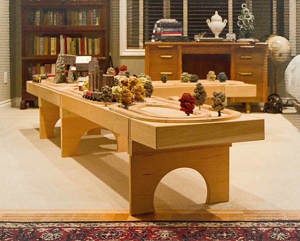Une solution pour une maquette ferroviaire à grande échelle peut être une table de train. Malheureusement, la plupart de ces tables sont trop grandes pour être transportées facilement, ou pour en atteindre l’autre côté. Quelques-unes peuvent être accolées pour créer une table plus grande, mais il est alors nécessaire que les deux bords soient au même niveau pour que les trains du circuit passent sans encombre la jointure. Comme peu de maisons ou d’appartements ont assez de place pour disposer d’une grande table de train au milieu d’une pièce, des tables de train plus étroites sont une autre solution, plus pratique. Des clubs de modélisme ferroviaire ont développé un certain nombre de solutions qui peuvent être adaptées pour les circuits miniatures en bois, dont les tronçons modulaires. Ces derniers facilitent le transport de grandes maquettes et permettent des reconfigurations, ou même la collaboration entre des clubs de modélisme ferroviaire, ou des familles, avec des tronçons compatibles. Les circuits sur étagères étroites constituent une stratégie alternative quand l’espace est limité. Ils offrent l’accès à toutes les voies depuis un seul côté de la maquette, ce qui est crucial quand le dispositif est contre un mur, au lieu de monopoliser le centre d’une pièce.